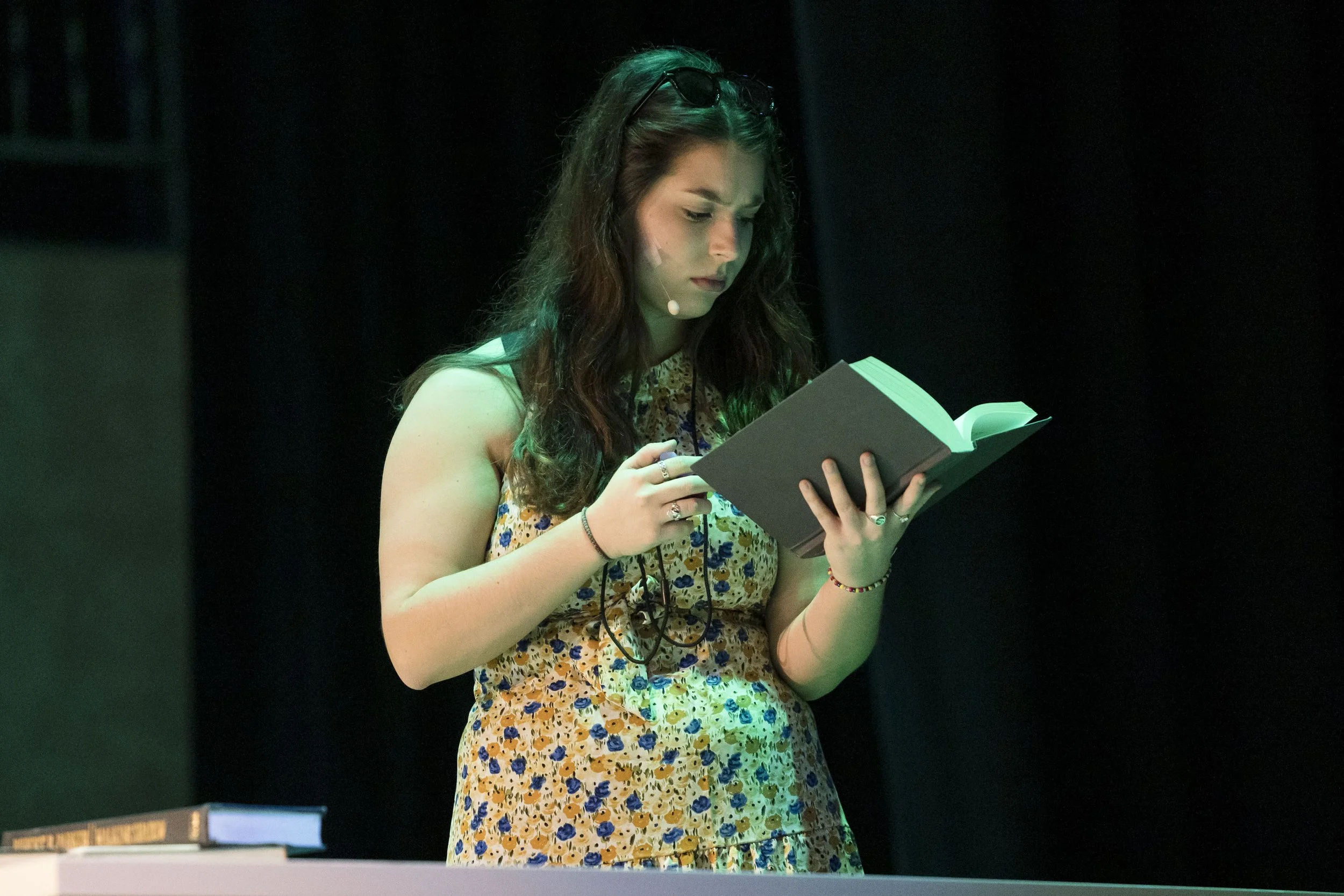 Juliet (Josie Mi) contemplates taking the potion given to her by the Friar. This potion was made using water and gel based food dye, with a white gel food dye used to cause the opaque effect, intended to emulate a "green drink." Photos by Peter Ringenberg.
