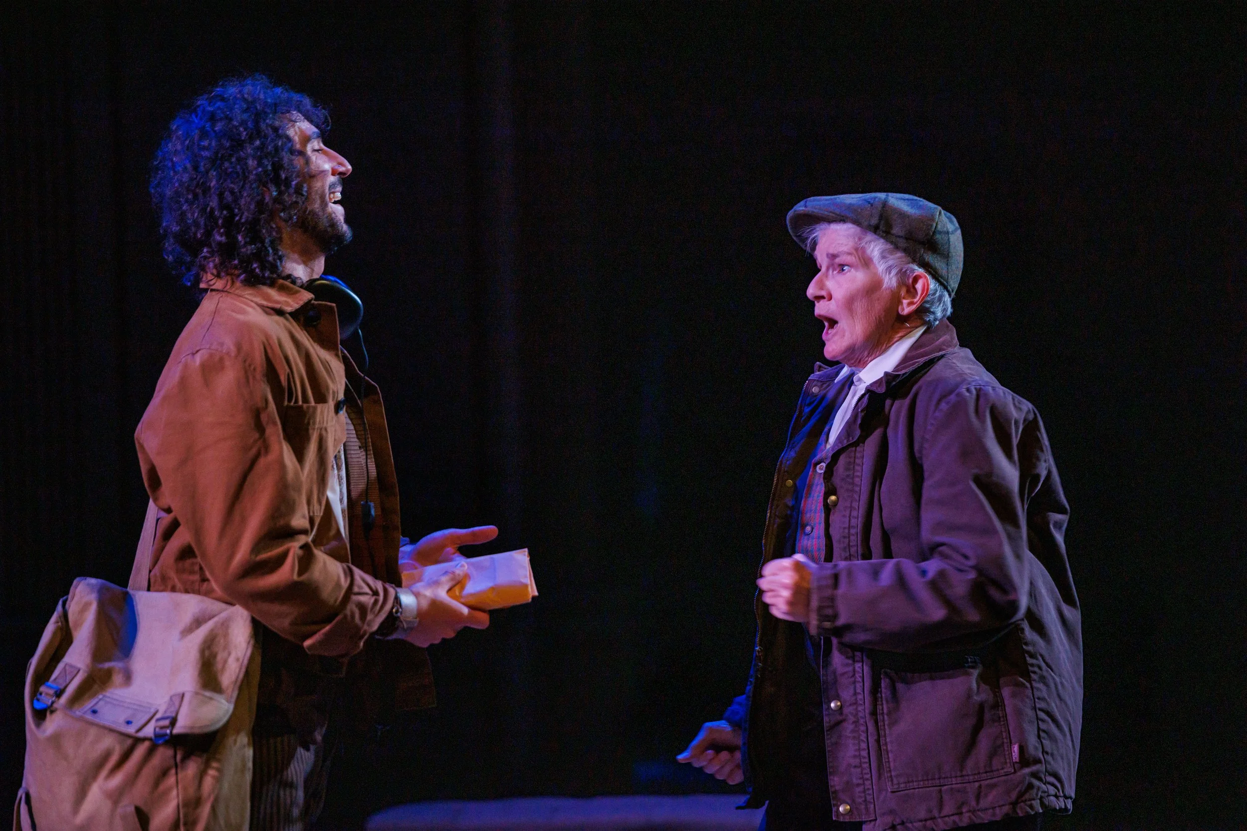 Romeo (Krosby Roza) buying poison from the Apothecary (David Chudzynski). In our world Mantua is a rehab center, Romeo can be seen here holding a bag of his clothes as you would receive upon leaving an inpatient facility. The poison was also a tinfoil square, an image commonly associated with Fentanyl, a hot button issue in the media especially in the area. Photos by Peter Ringenberg.