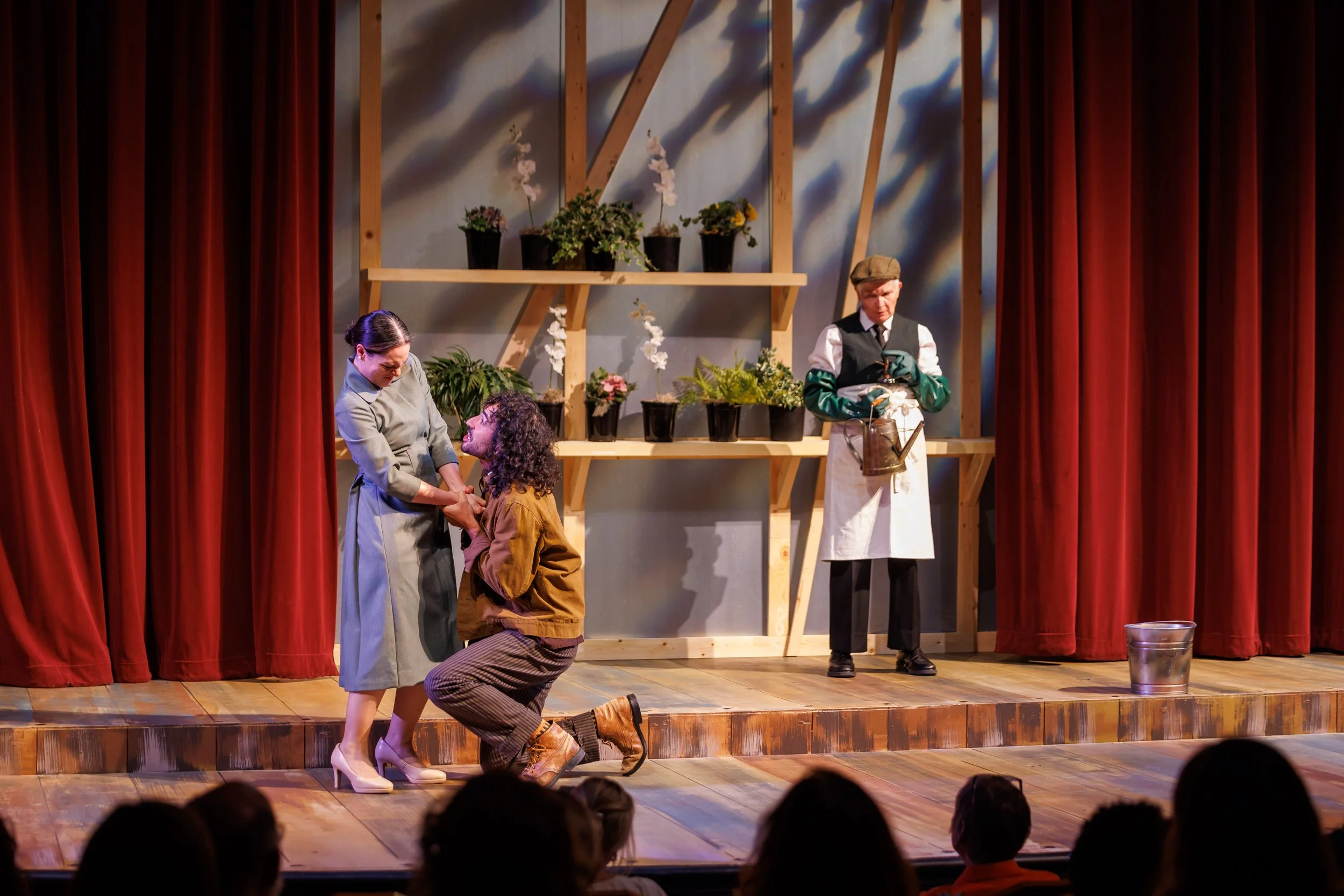 The Nurse (MaConnia Chesser) and Romeo (Krosby Roza) can be seen talking about Romeo's marriage proposal. He is seen here holding a pink rose, as a pink flower is referenced in a prior line, and the rose is a symbol of the Montagues in our world. Photos by Peter Ringenberg.